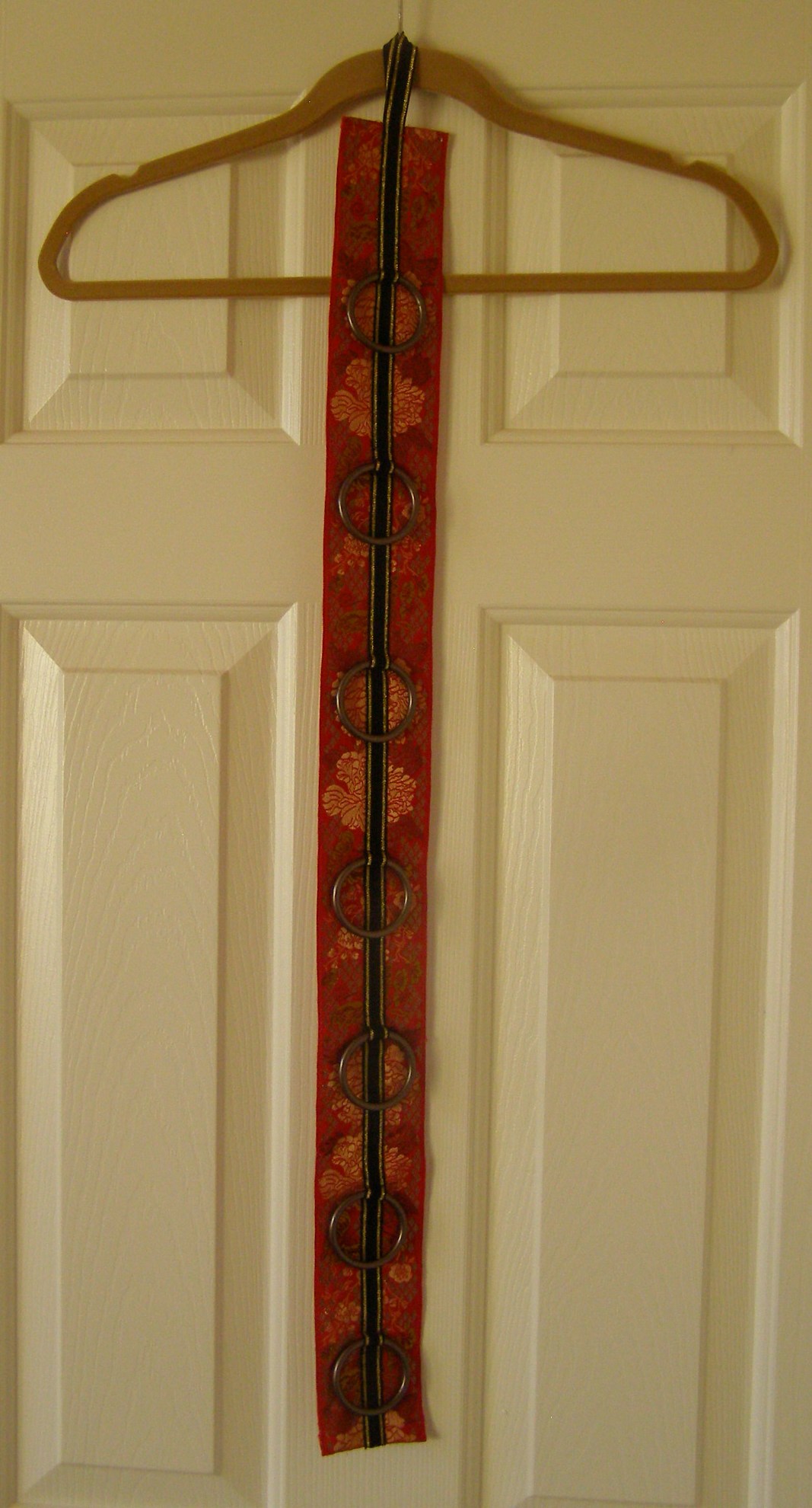 - Continue until all rings are pinned. The narrow ribbon should extend 10″ or so above top of wide ribbon.