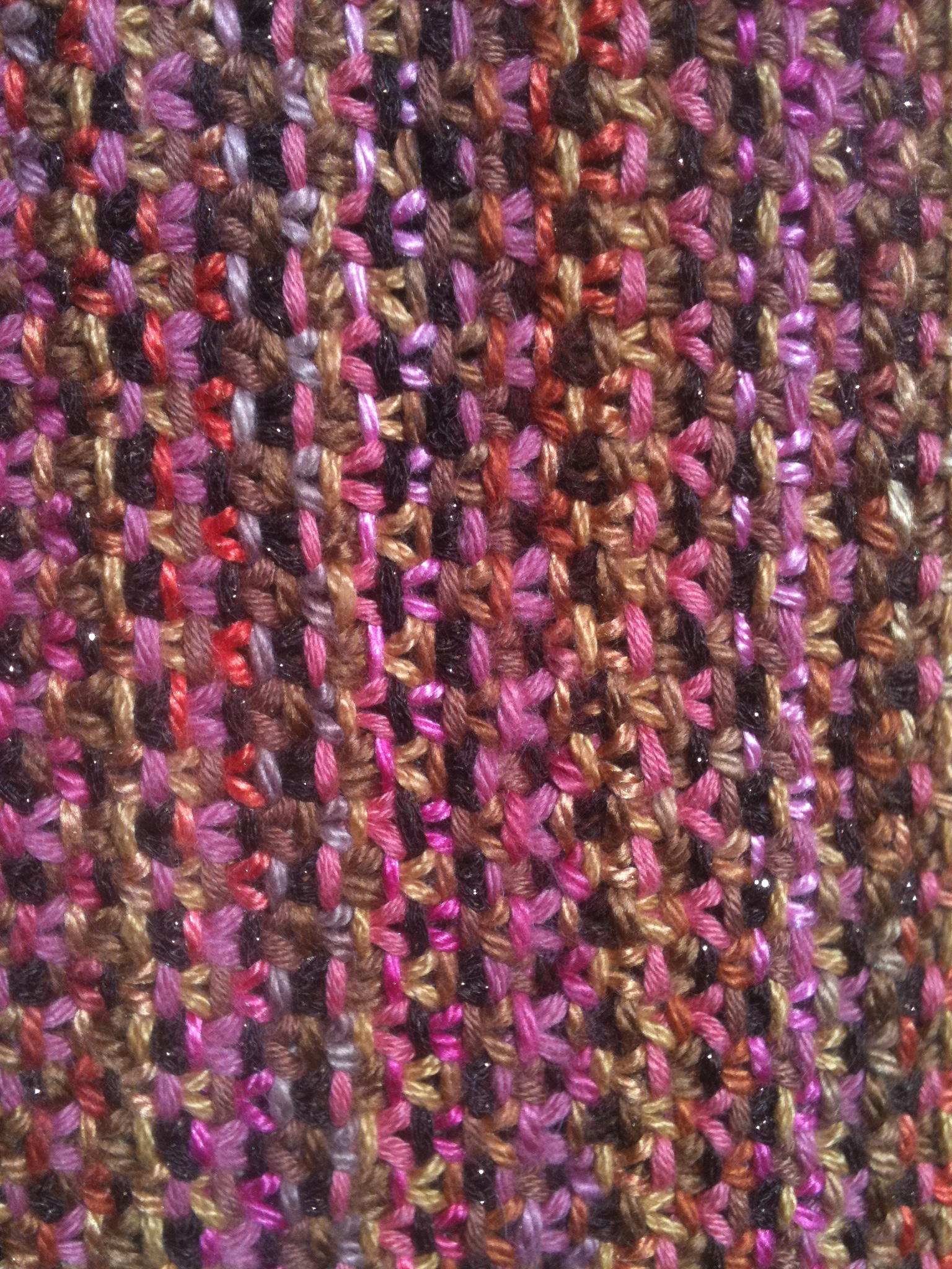 Returning to the start of the cast-on, I started the Linen Stitch with a mystery dark brown acrylic highlighted with a gold metallic thread (absolutely no idea why I have this yarn).