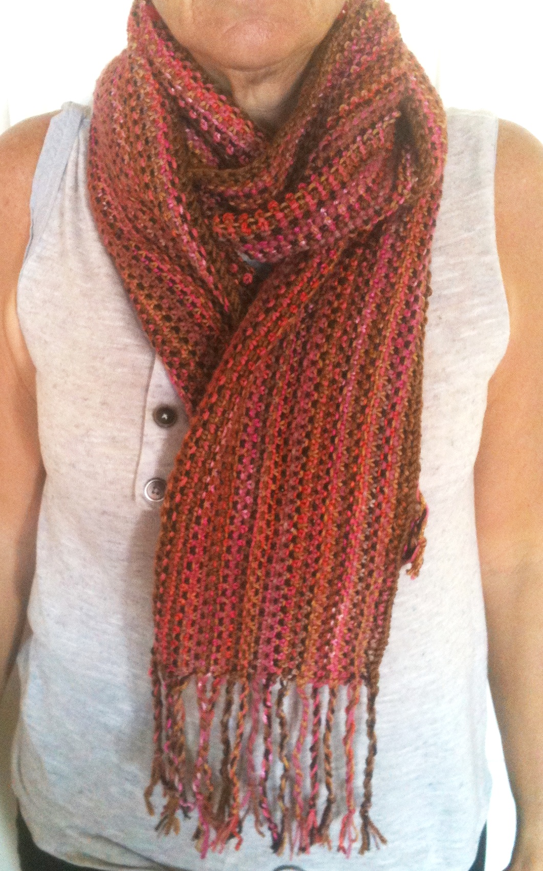 I love your scarf. I find linen stitch scarves very addictive. I’ve done two and am eyeing off my stash for more yarn combinations.