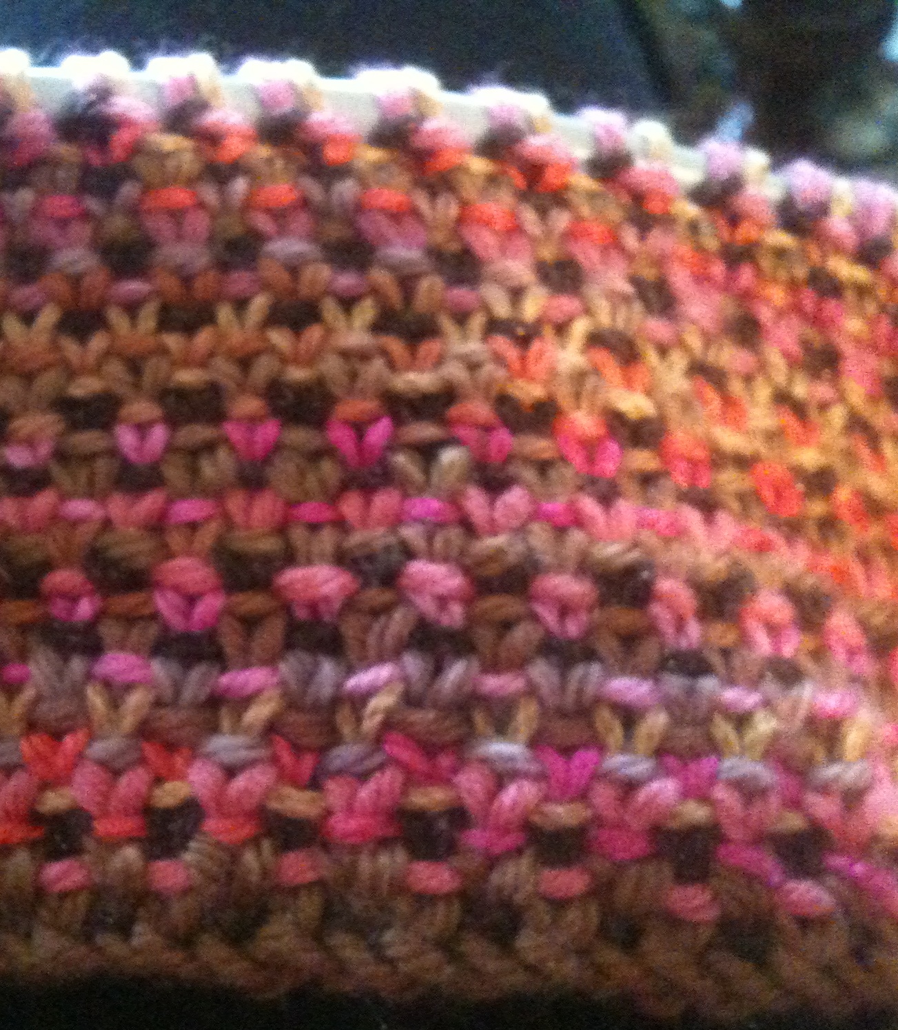 After 66 rows, the Caramel Acrylic was used for the final Linen Stitch row and then again to bind off.