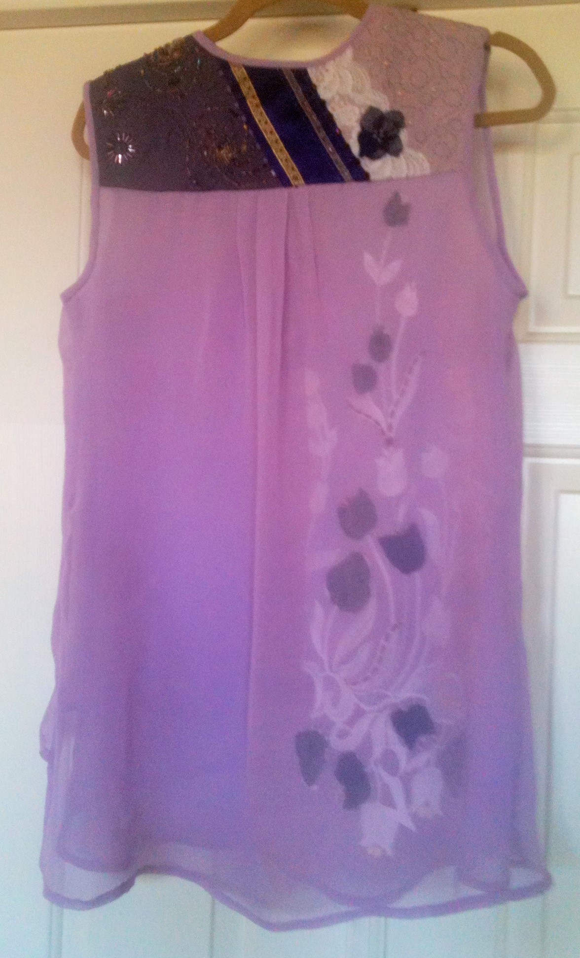 The yoke is heavily embellished with stitching and beading. As the sheer silk has little or no structure, it was layered over linen.