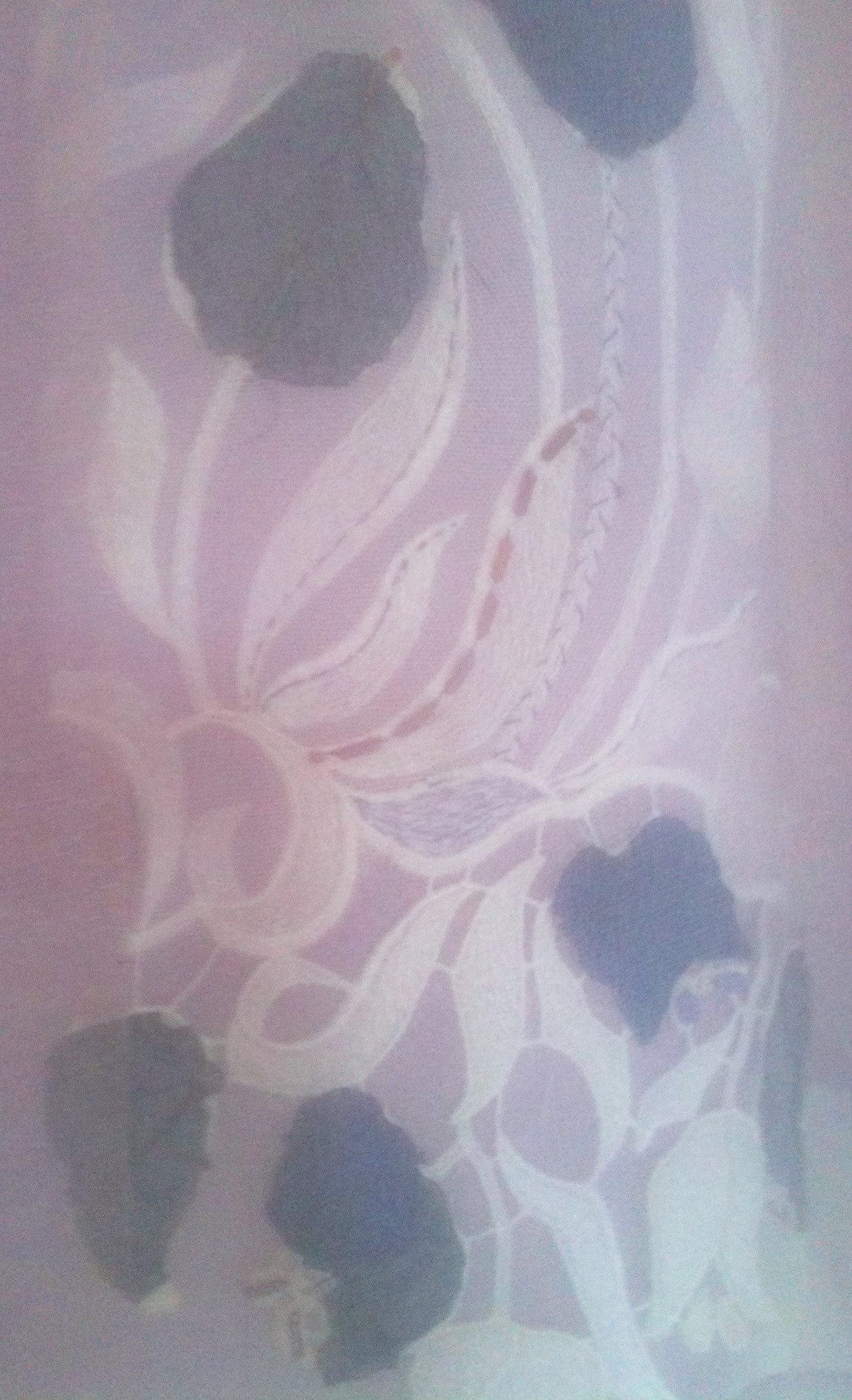 The lace was embellished by burning (with a candle flame) the edges of petals cut from scraps of dark violet fabric. Beads and embroidery stitching were used to stitch the petals to the lace and highlight some of the lace pattern.