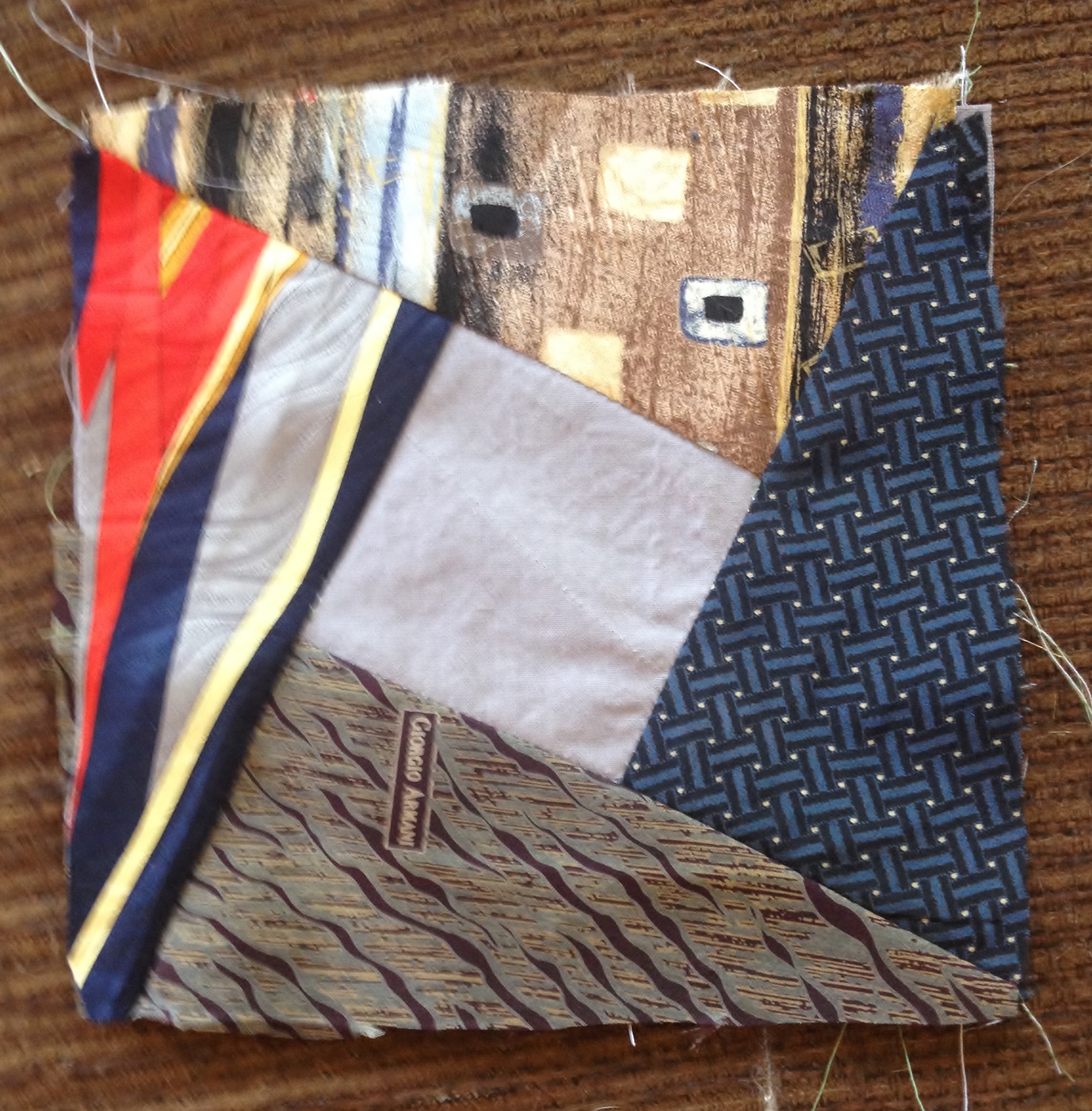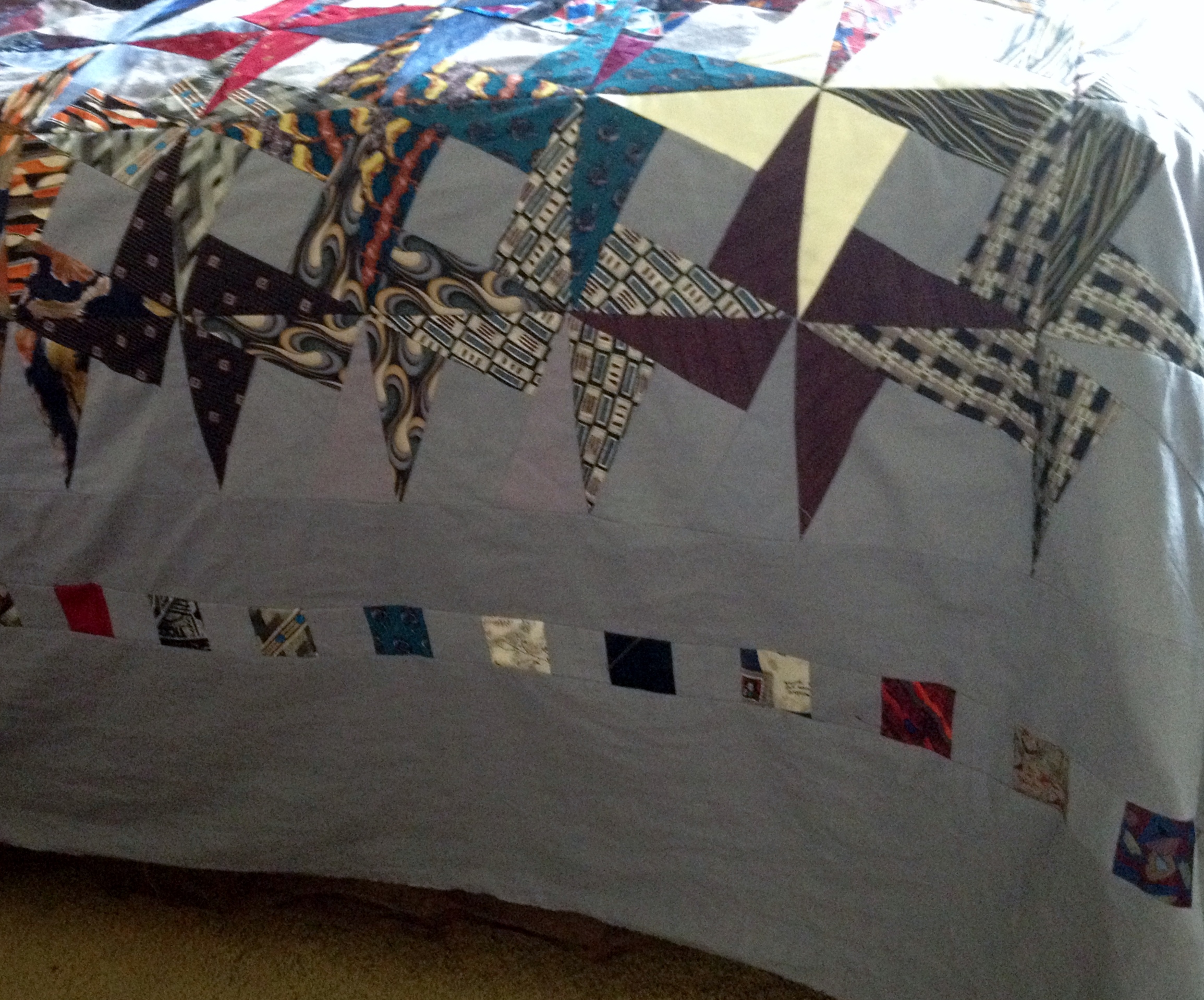 The top took some time to piece, but it was always intriguing to see how each tie worked with the colors and textures of the adjacent ties. Now that the piecing is done – it is off to the wonderful long armed quilter so she can work her magic!