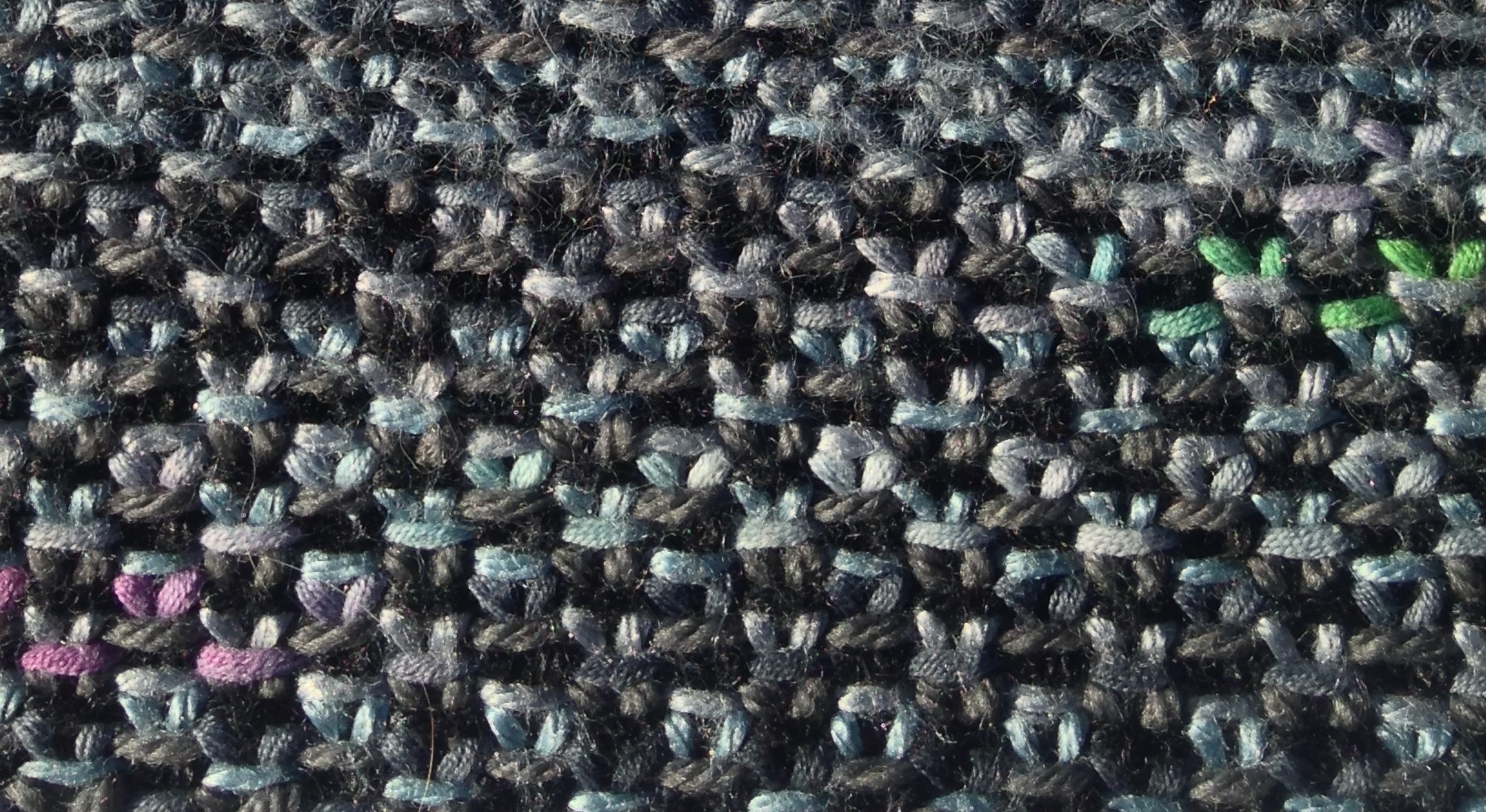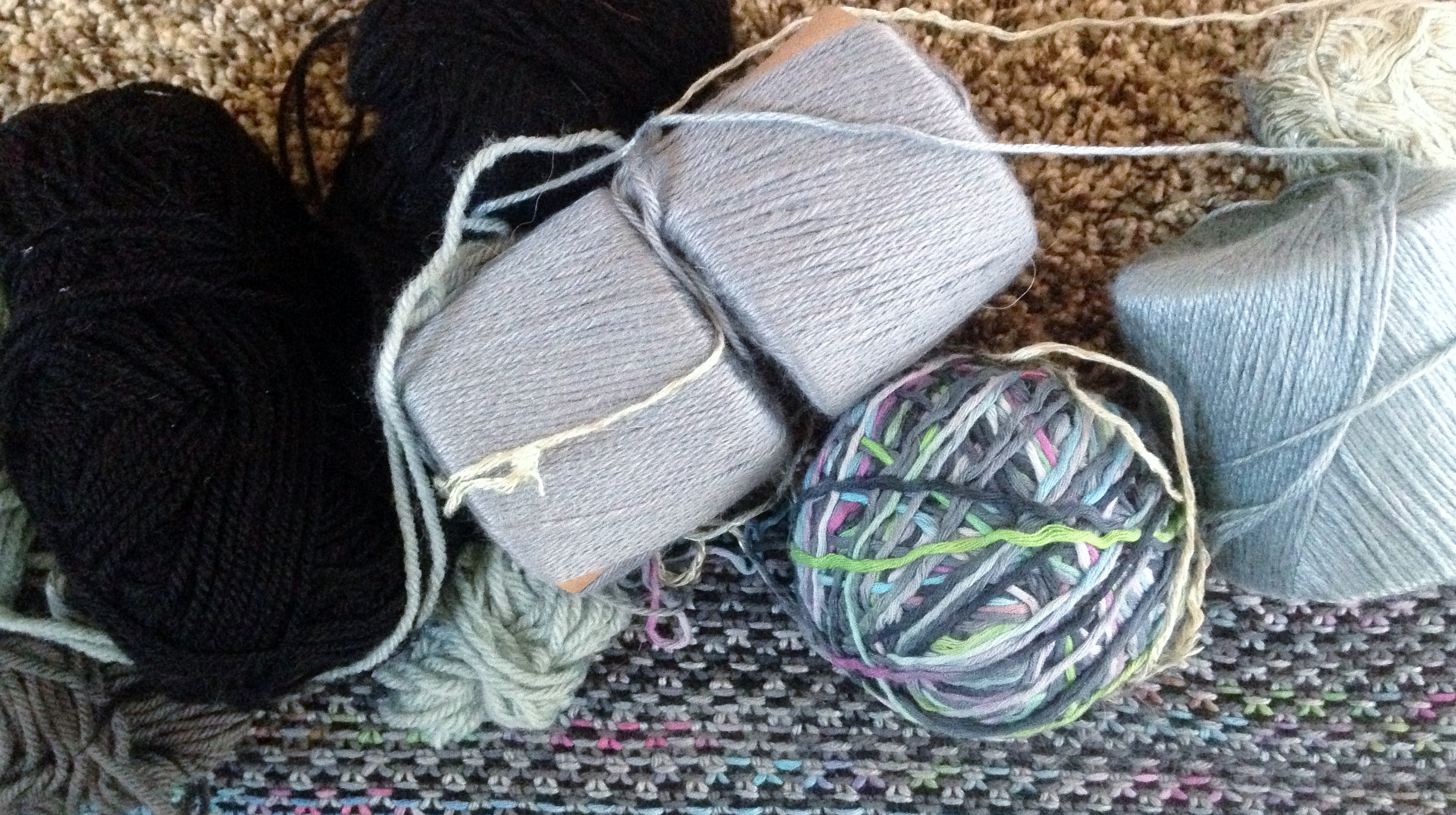 The black and dark grey were eventually replaced completely with lighter greys and bluish greys and small amounts of sage green. The sage was leftover from this sweater.