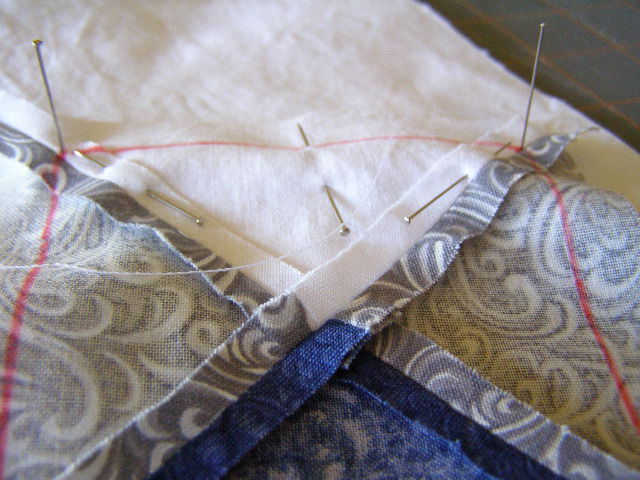 Poke a pin through the line marking the corner of the DHST into the line marking the corner of a plain square – RIGHT SIDES TOGETHER. Keeping those “pokes” vertical, pin to secure.